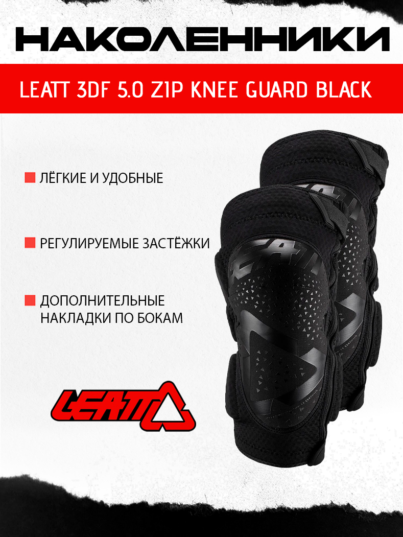 Leatt всегда прислушивается к своим покупателям и на этот раз выпустил версию легендарных Leatt 3DF 5.0 с застёжкой на молнии. Кроме как застёжки, в наколенниках ничего не изменилось. Они также отлично защищают даже от сильных ударов благодаря вставкам из патентованного пеноматериала со сложной трёхмерной структурой. Синтетический материал внутренника хорошо отводит влагу, внешняя часть усилена арамидным волокном для устойчивости к истиранию.
