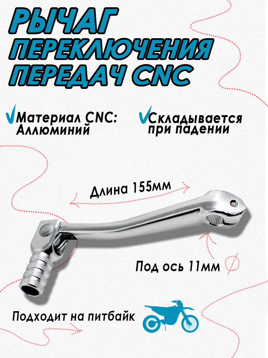 Ножка переключения передач для питбайка. Материал: аллюминий. Посадочный диаметр 11 мм. Цвет: серебристый.