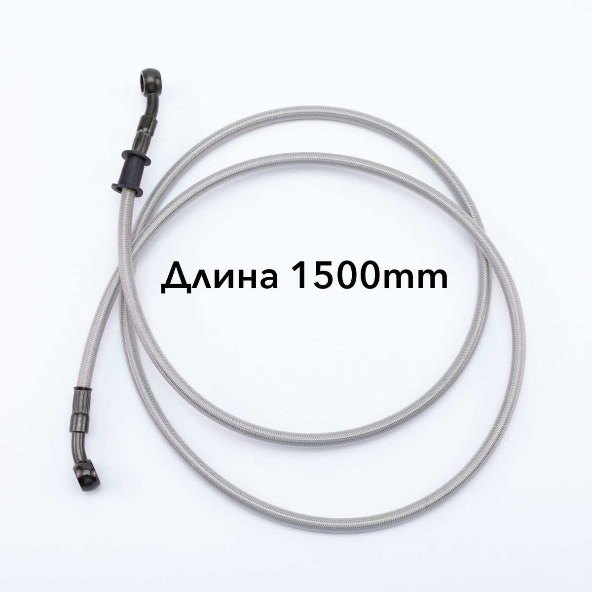 Длина тормозного армированного шланга составляет 1500мм (150см) по центрам отверстий под банджо болт.