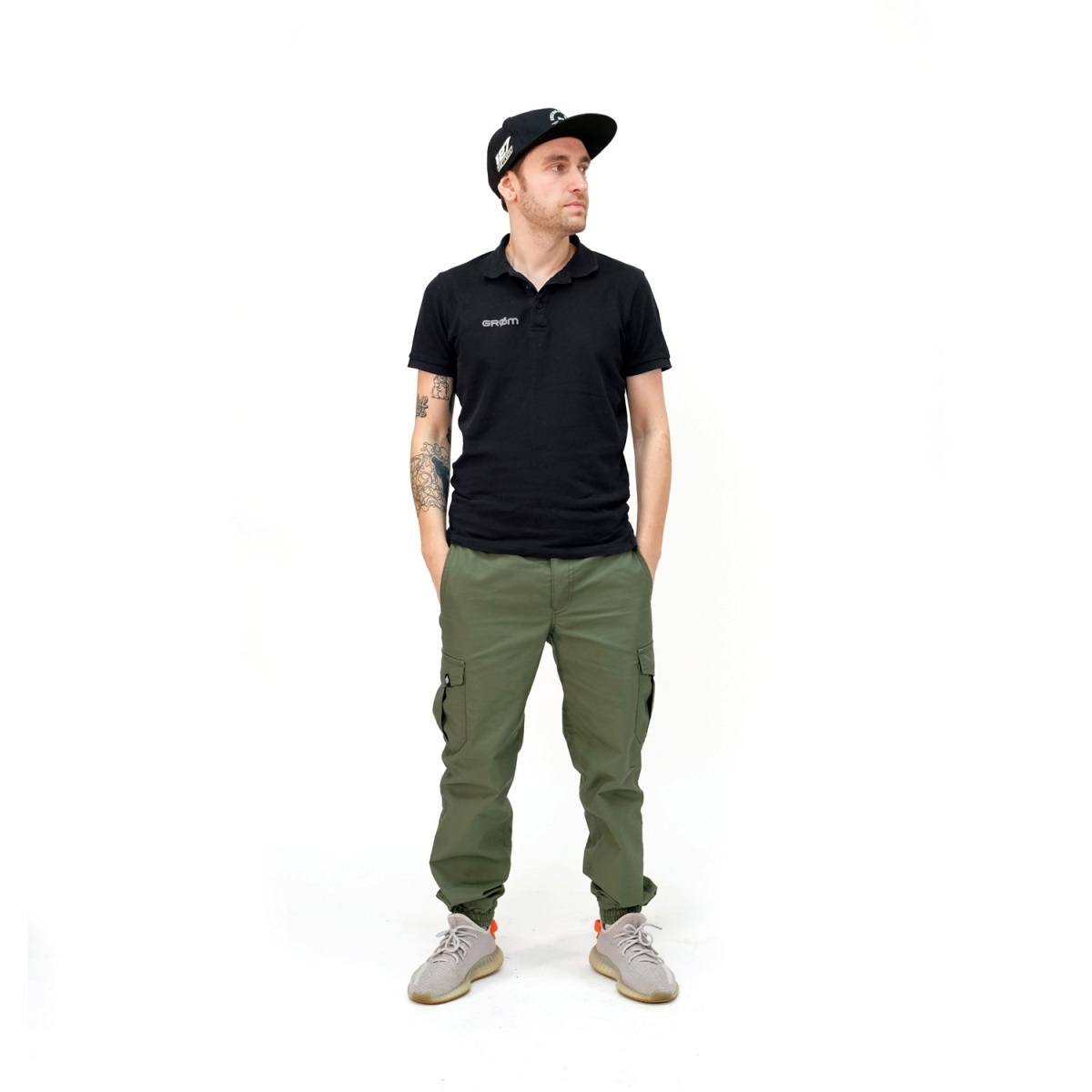 Манжеты нож на резинке. Боковые втачные классические карманы и 2 боковых объемных карго кармана. Задний открытый карман